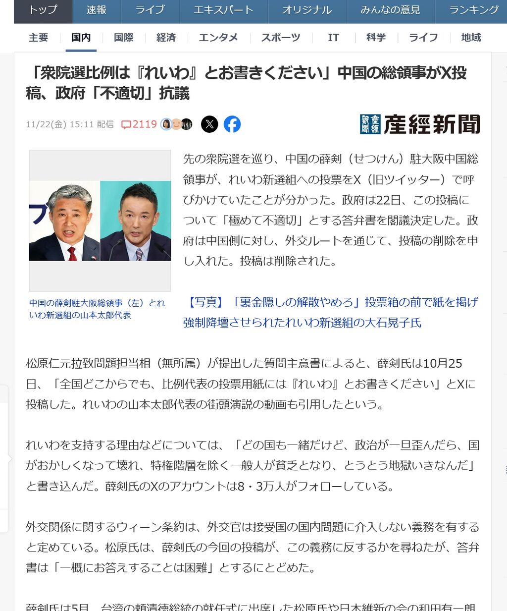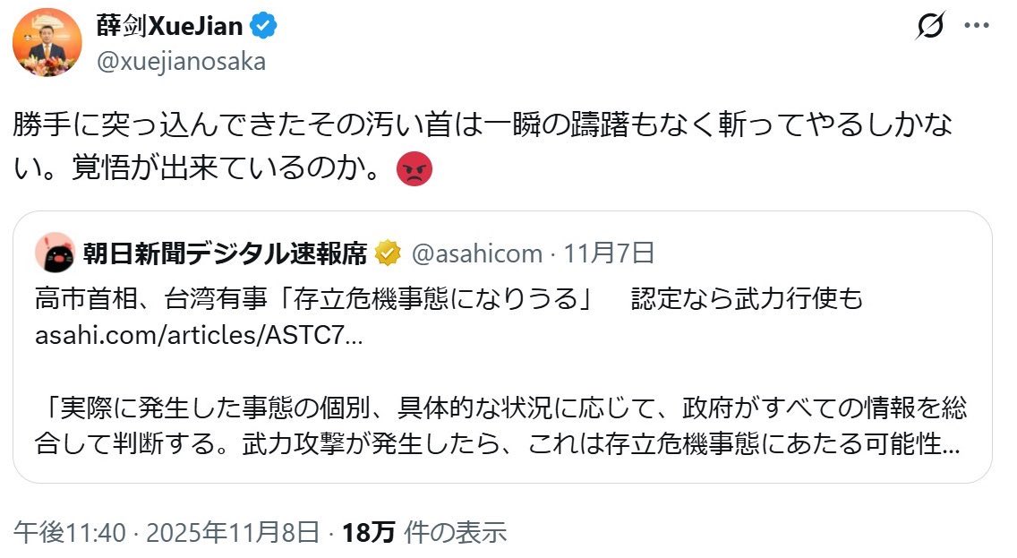 中国の薛剣(せつけん)・駐大阪総領事がX(ツイッター)で高市早苗首相の台湾有事を巡る国会答弁に対し、「勝手に突っ込んできたその汚い首は一瞬の躊躇(ちゅうちょ)もなく斬ってやるしかない」と投稿し、日本政府が強く抗議した。抗議後に投稿は削除されたが、9日に関連で別の投稿もしたため、日本が削除を要求している。